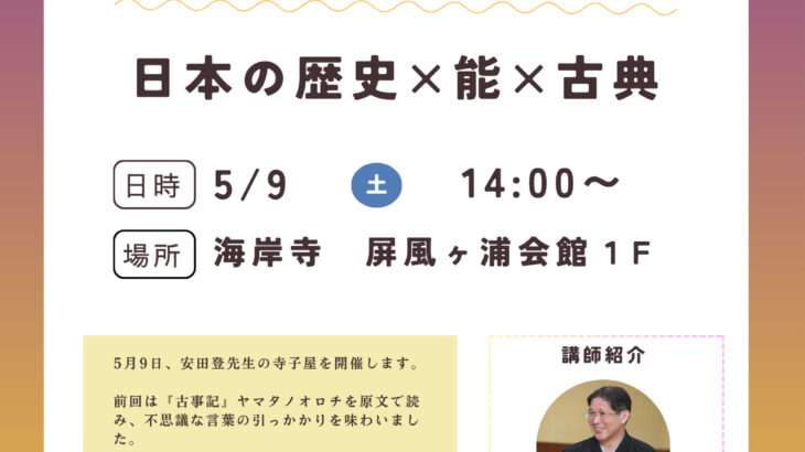 令和8年 第1回 安田登先生 寺子屋 開催のお知らせ 令和8年の最初の「安田登先生の寺子屋」を、2月7日 に開催いたします。新しい一年のはじまりにふさわしく、今年から寺子屋は新たな展開を迎えます。 これまで学んできた漢文や観音経といった古典の素養を土台に、日本の歴史・能・古典 を相互に結びつけながら、物語として味わう学びが本格的にスタートします。ことばが歴史となり、歴史が舞台となって立ち上がる—— […]